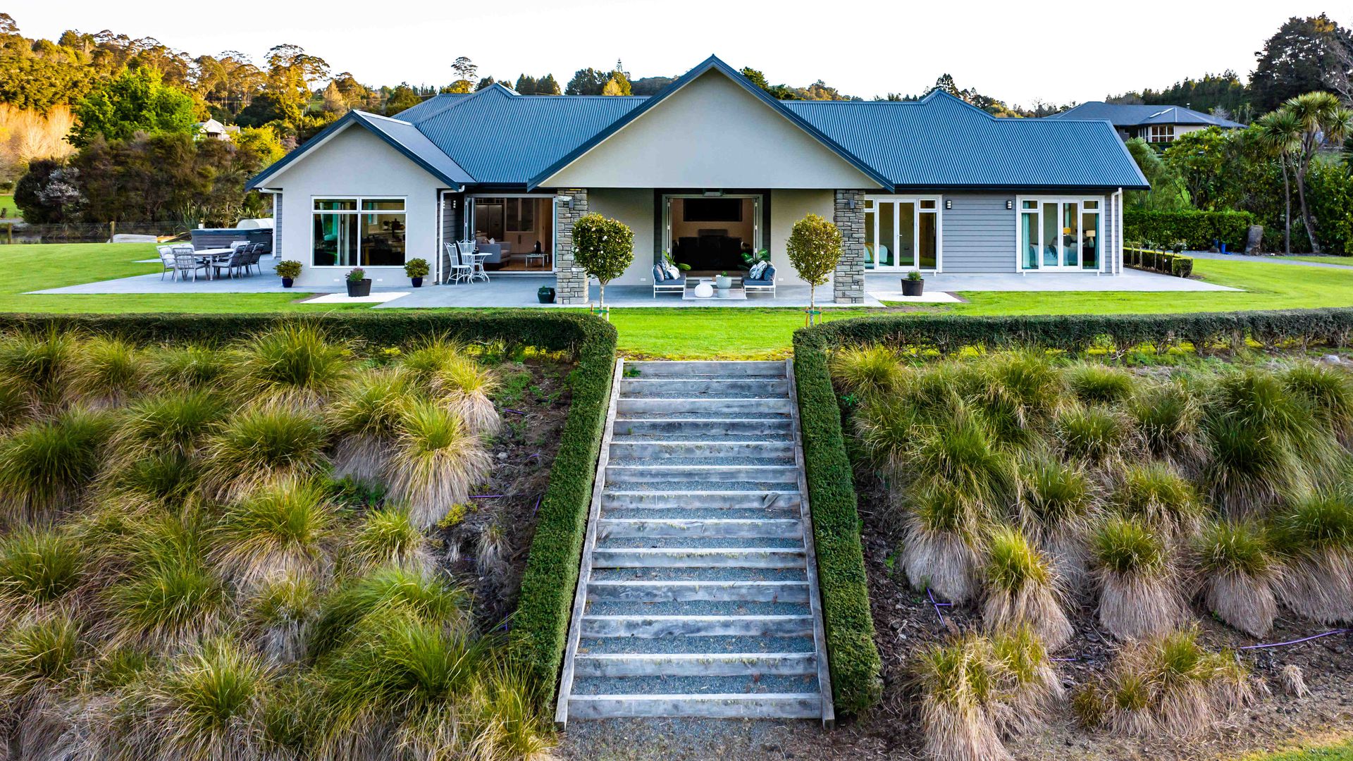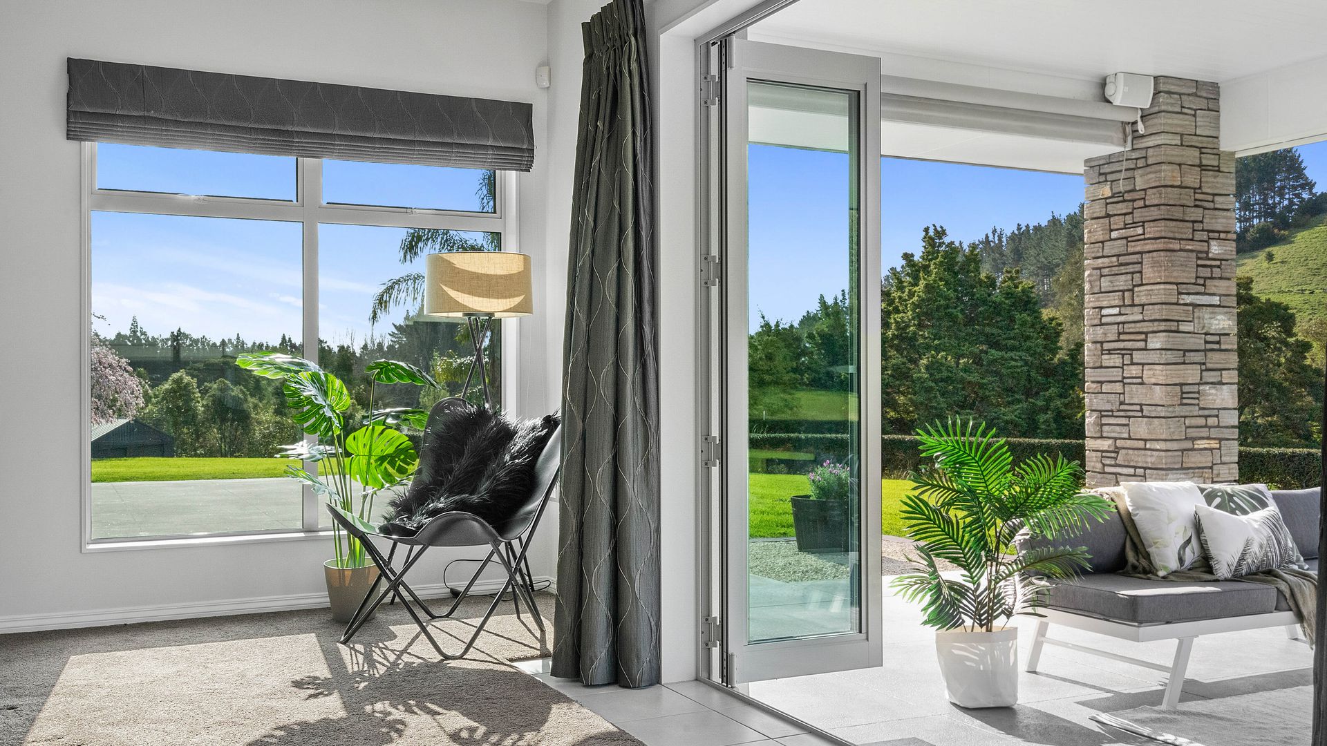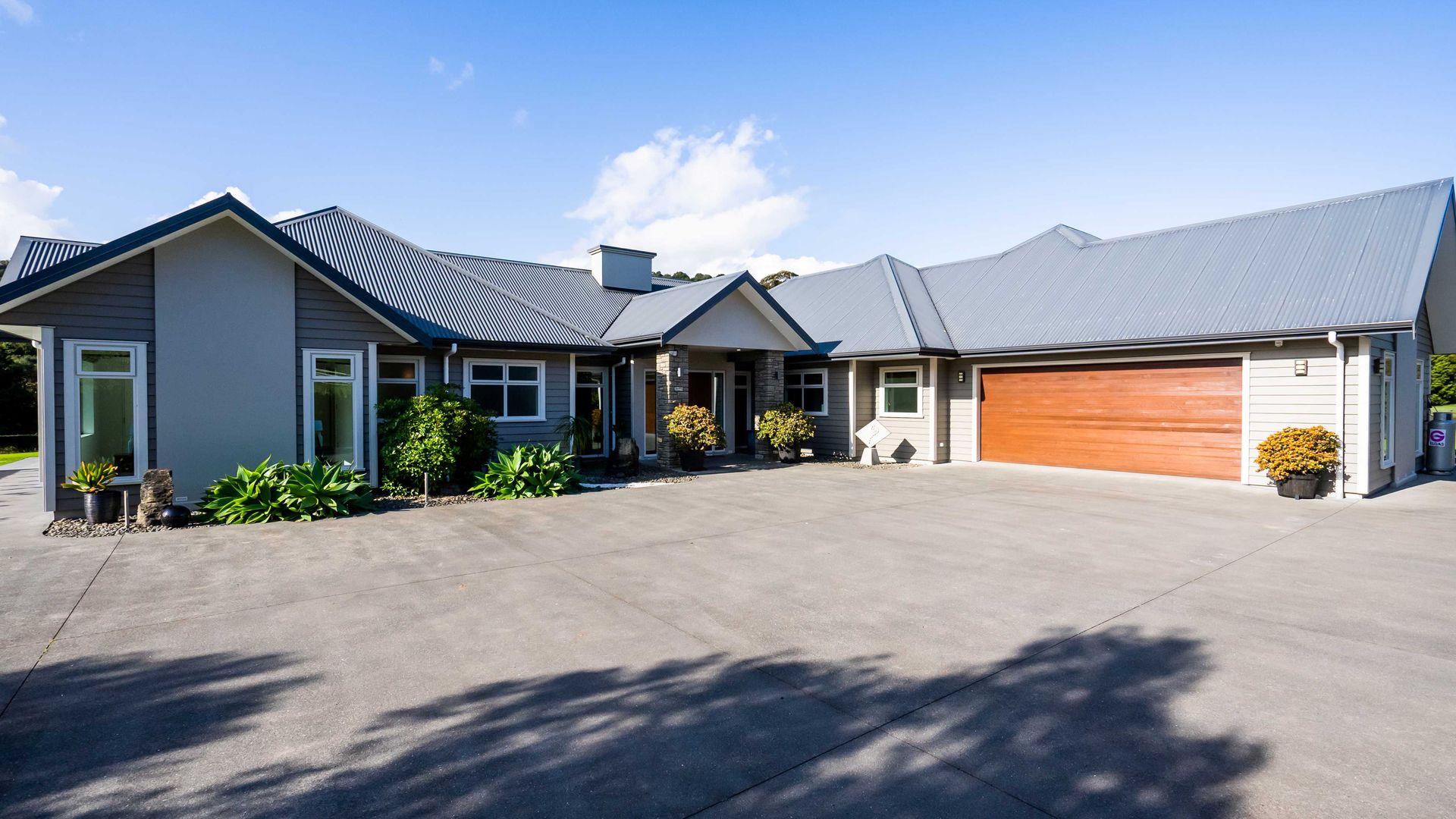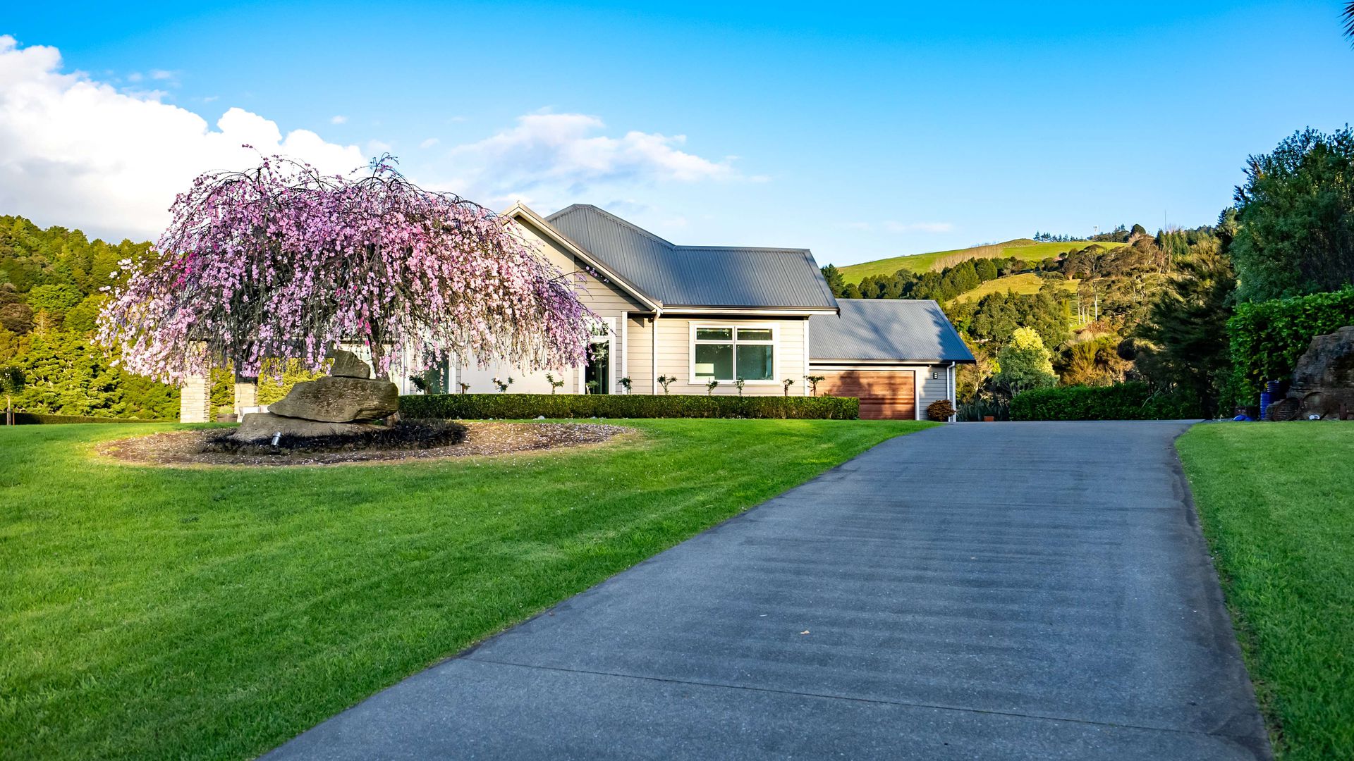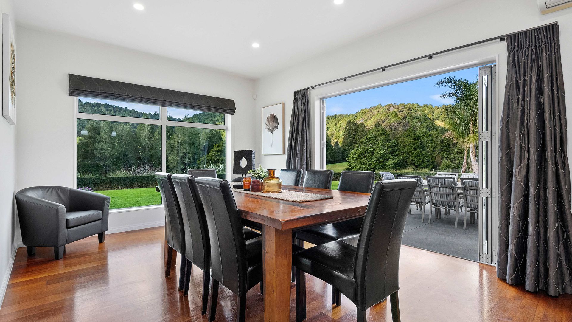 In the Kara Sanctuary at Maungatapere, this five-bedroom residence delivers resort calm with rural freedom. A crisp, entertainer’s kitchen with scullery anchors generous open living and bi-folds open to a stone-pillared loggia and broad patios that invite you outdoors. Light, volume and long green views set the tone for everyday ease and celebration-grade gatherings.
