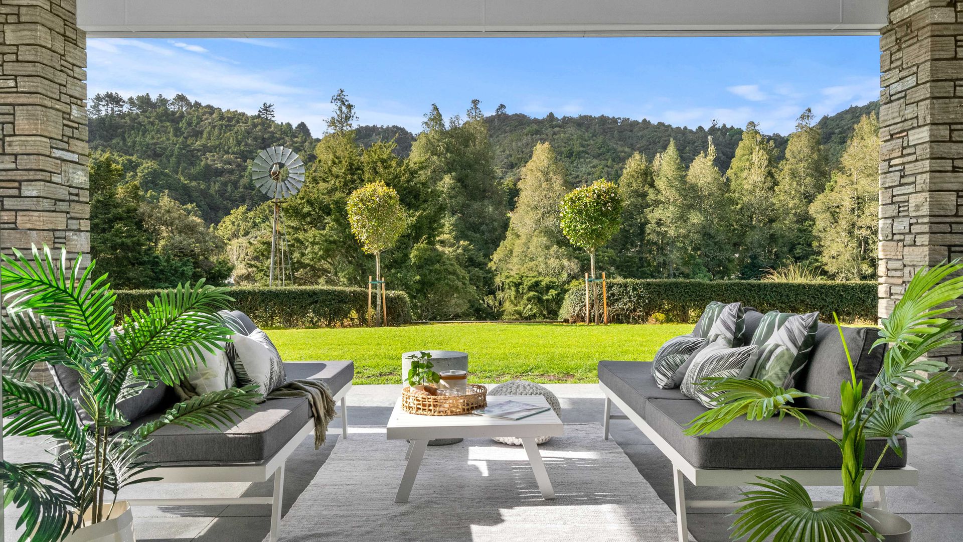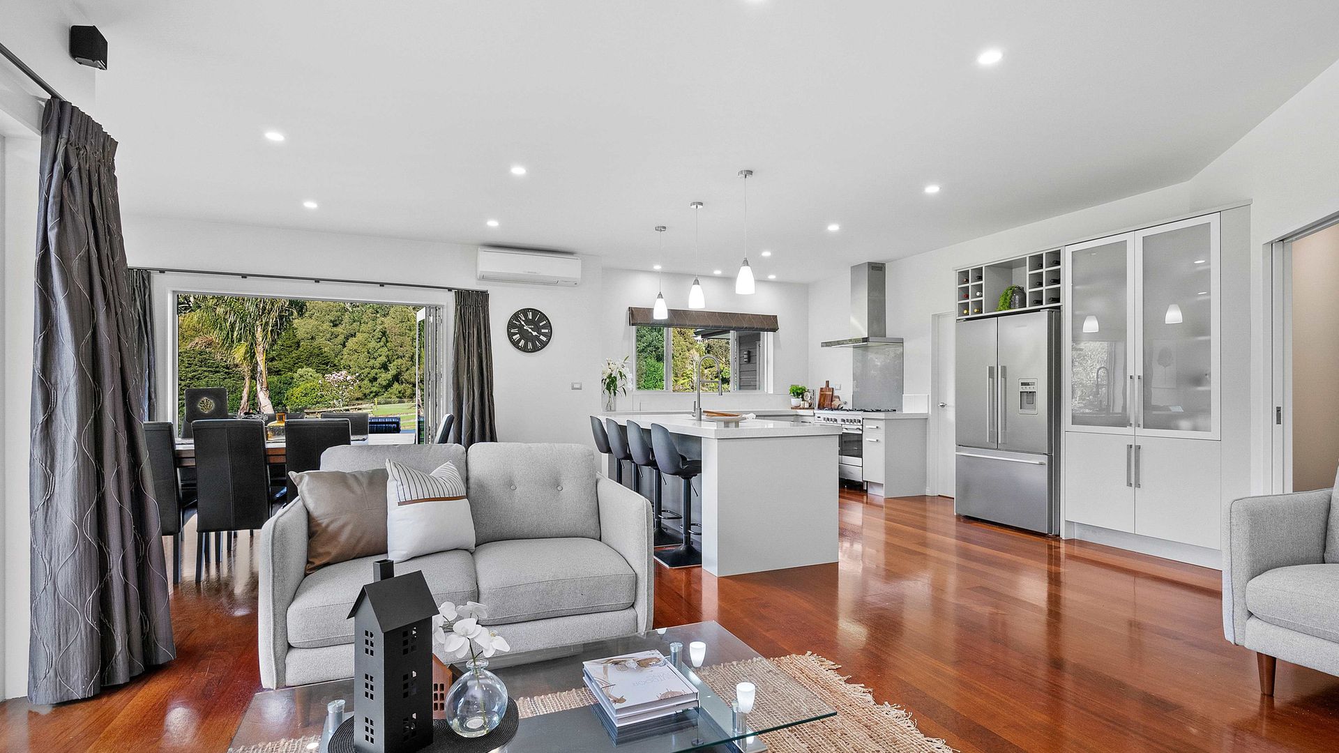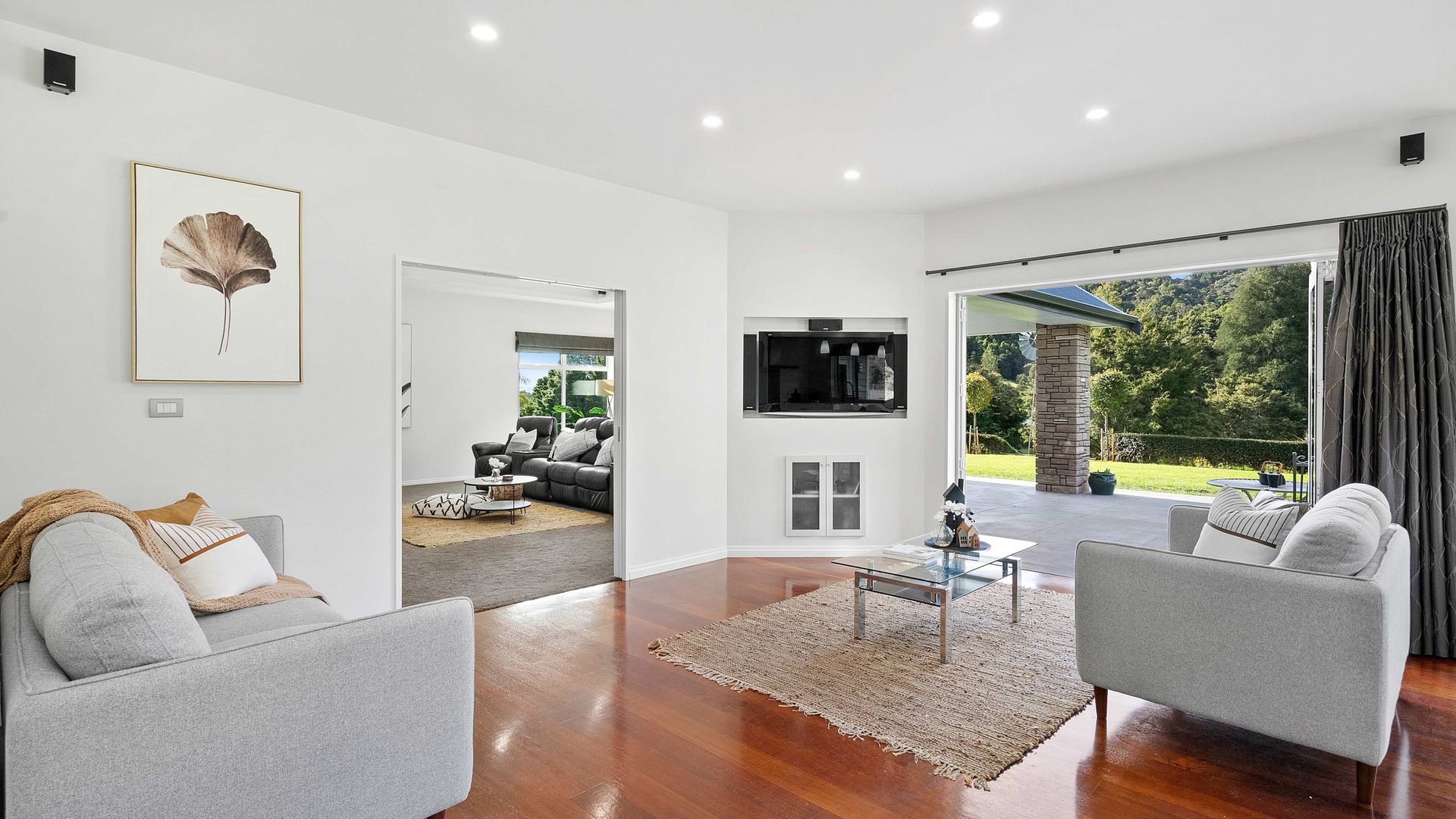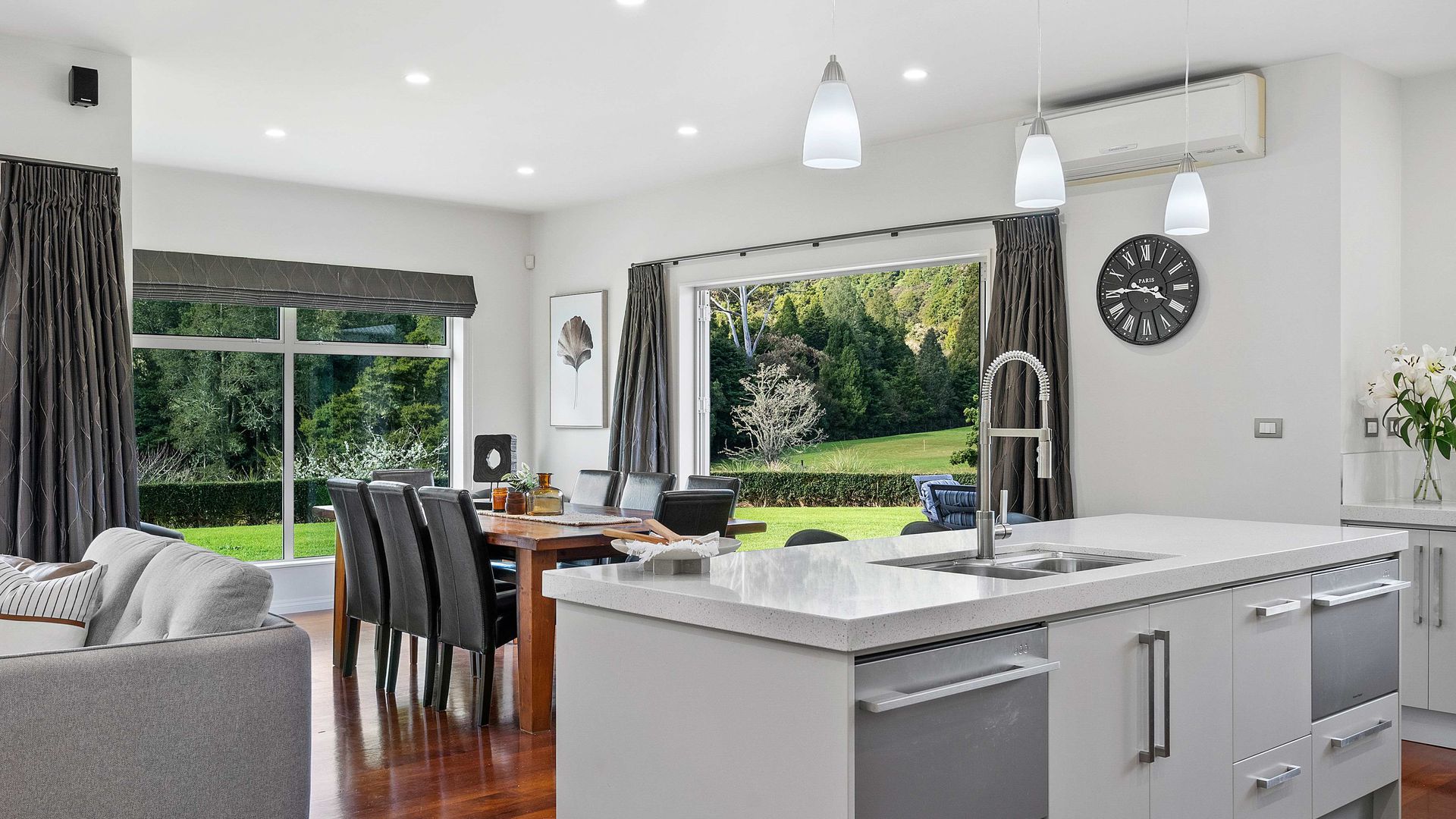 In the Kara Sanctuary at Maungatapere, this five-bedroom residence delivers resort calm with rural freedom. A crisp, entertainer’s kitchen with scullery anchors generous open living and bi-folds open to a stone-pillared loggia and broad patios that invite you outdoors. Light, volume and long green views set the tone for everyday ease and celebration-grade gatherings.