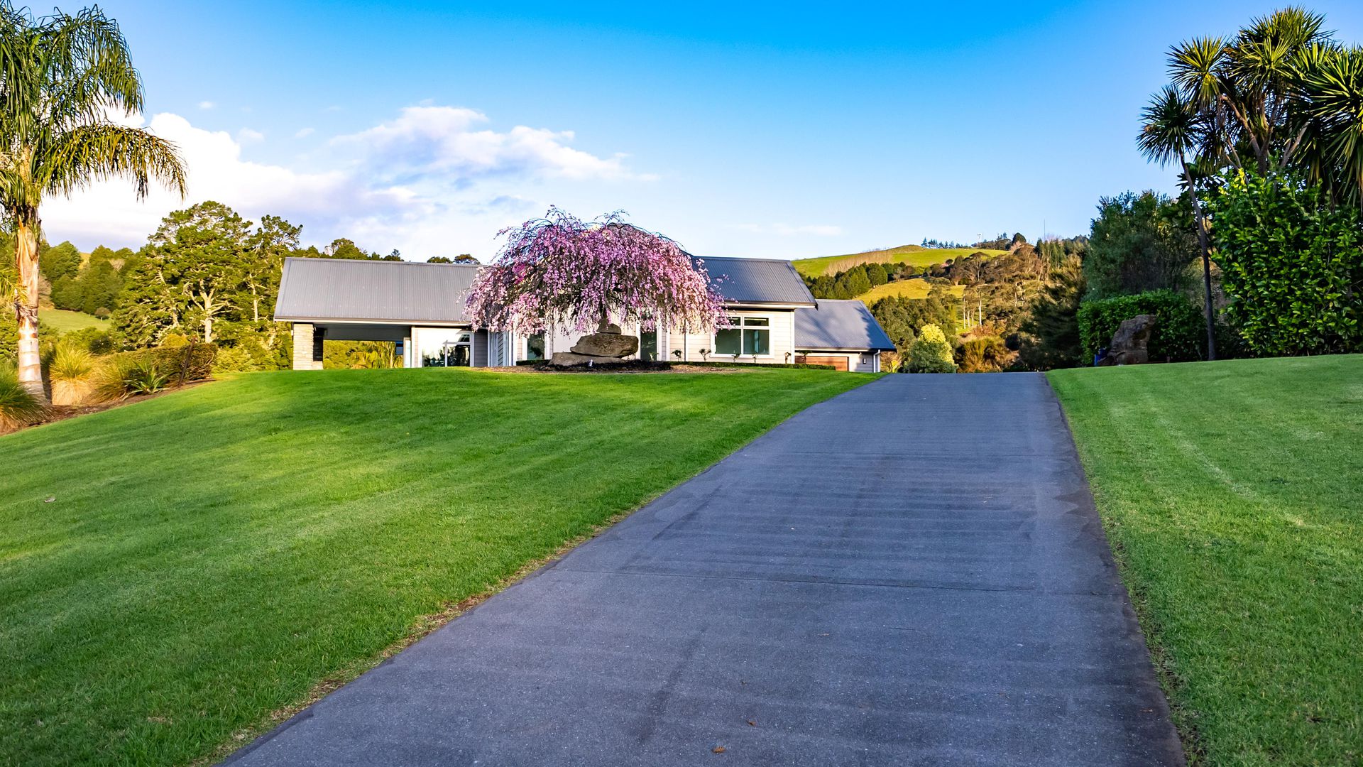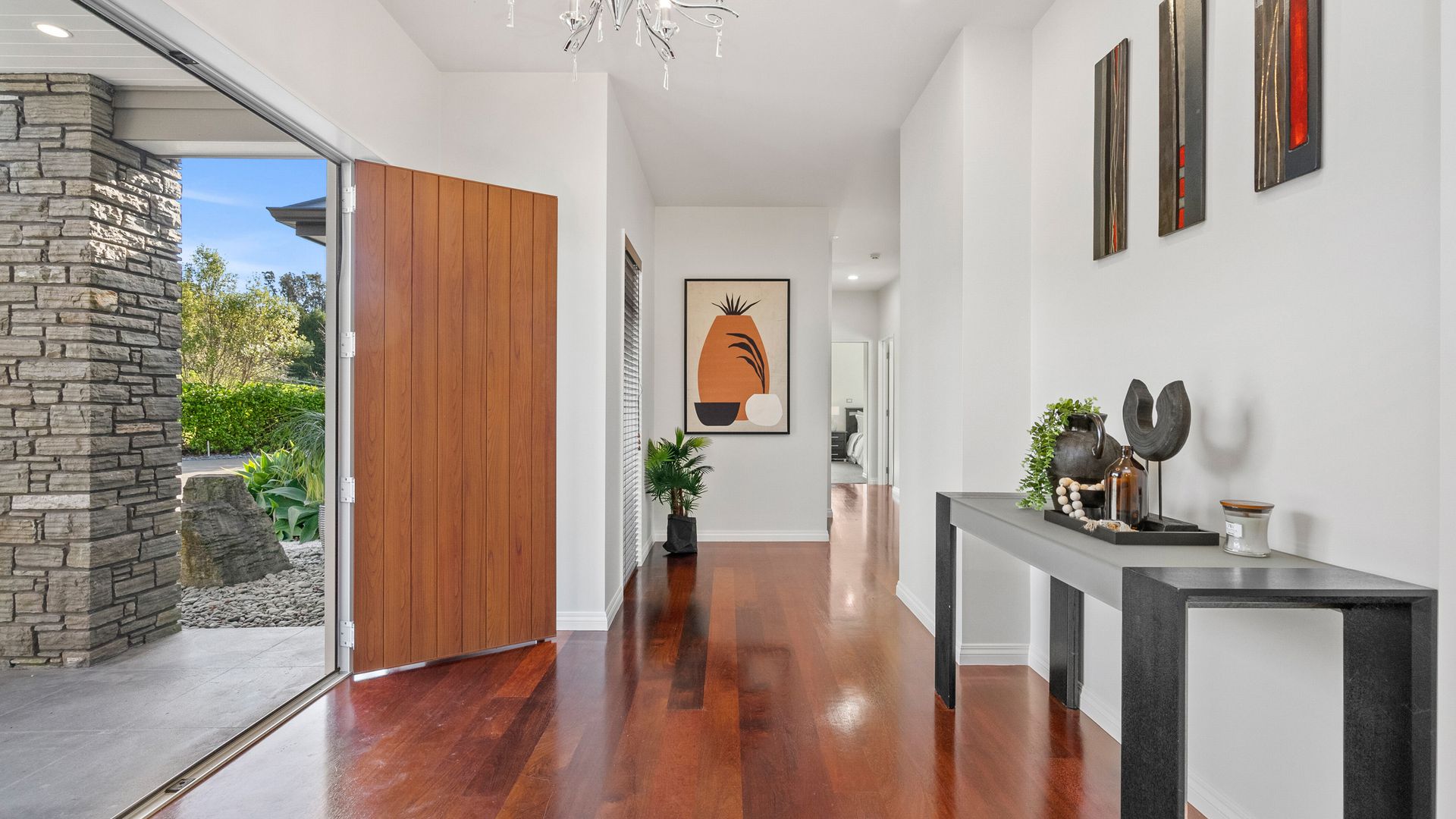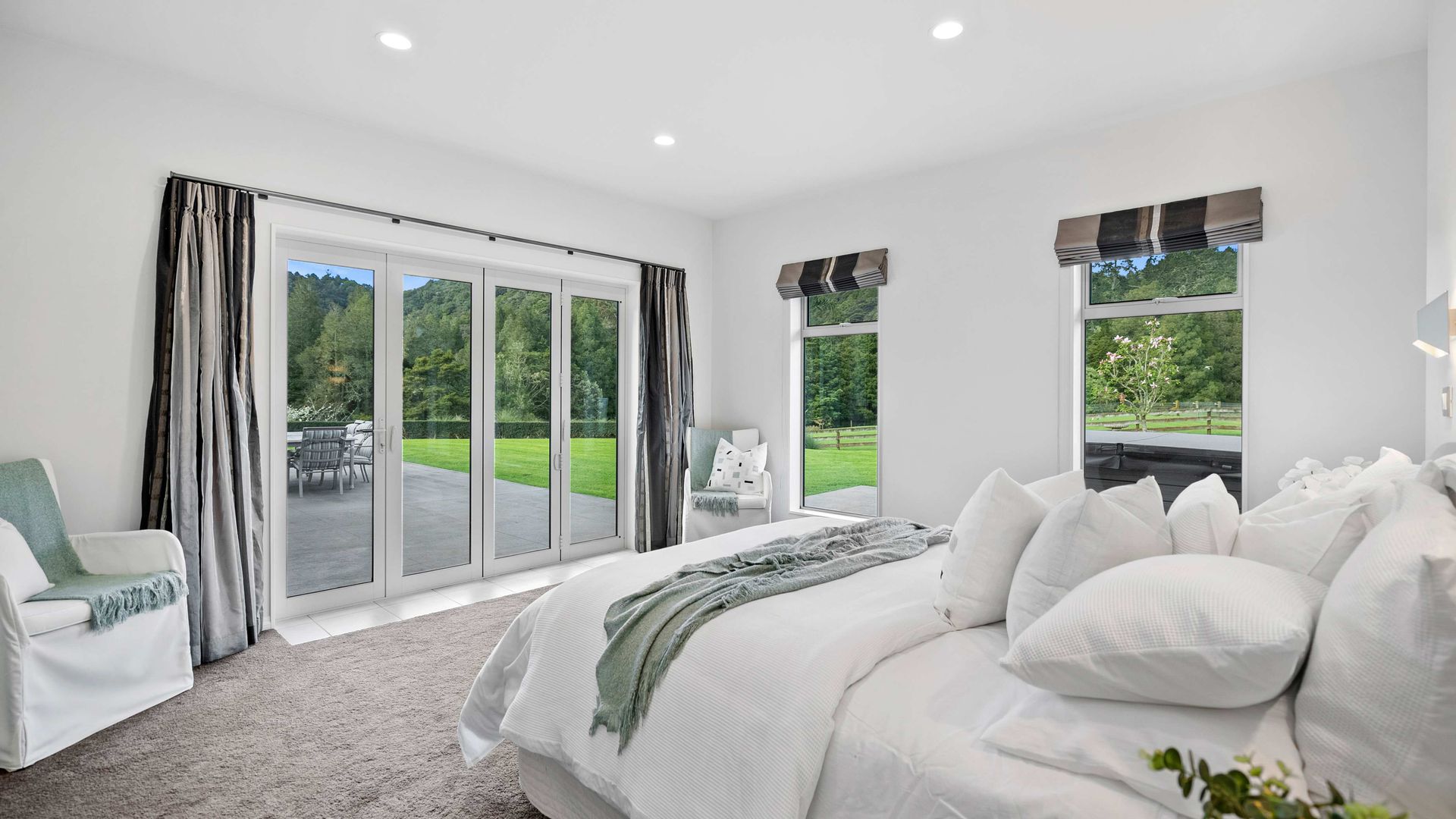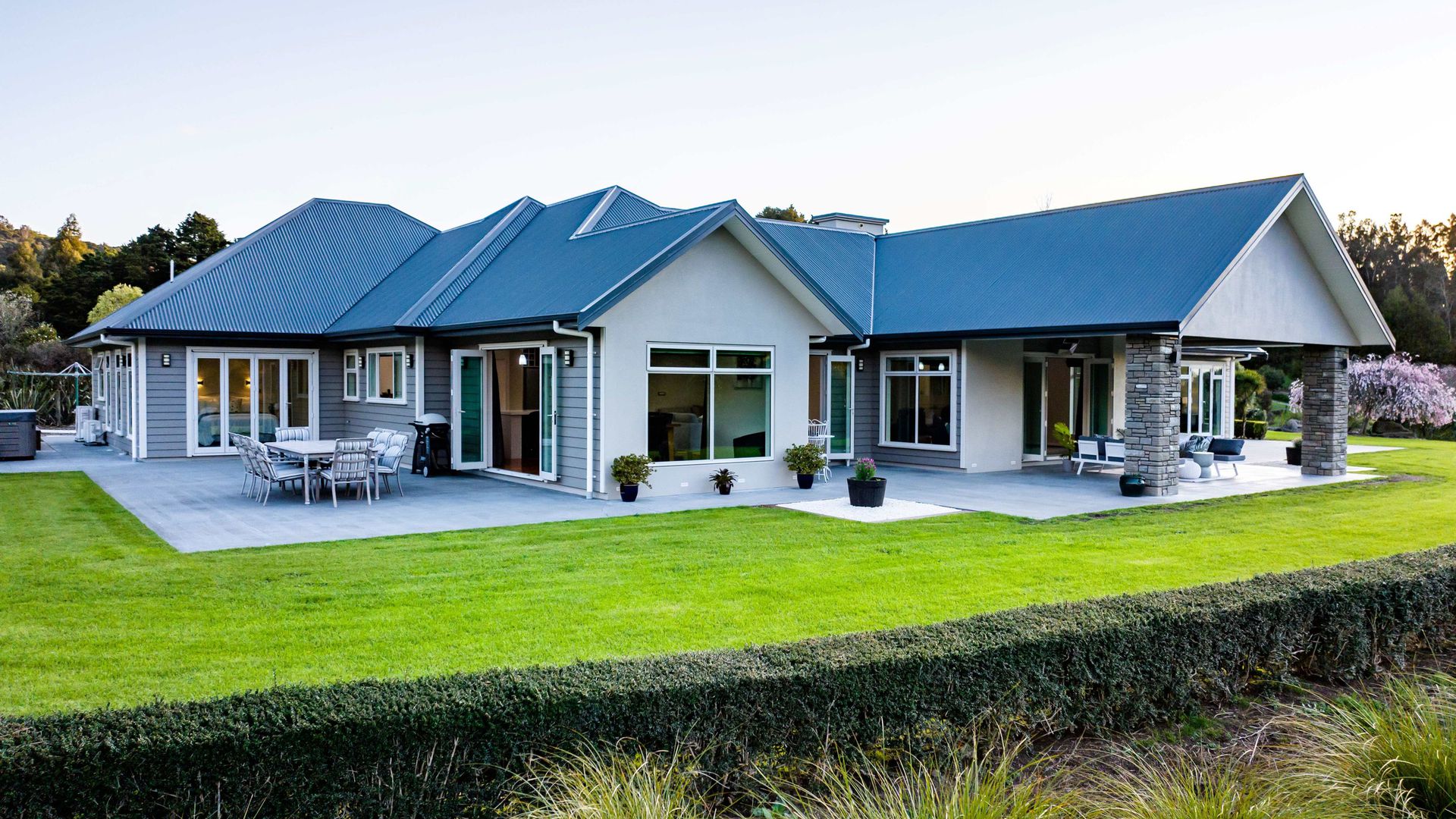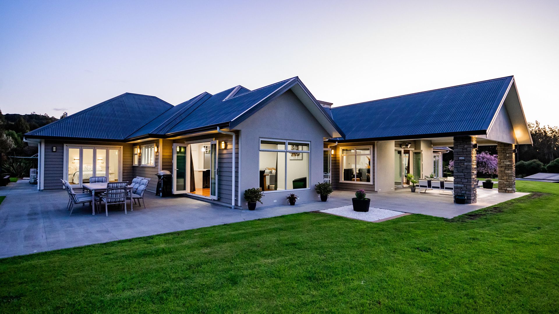 In the Kara Sanctuary at Maungatapere, this five-bedroom residence delivers resort calm with rural freedom. A crisp, entertainer’s kitchen with scullery anchors generous open living and bi-folds open to a stone-pillared loggia and broad patios that invite you outdoors. Light, volume and long green views set the tone for everyday ease and celebration-grade gatherings.