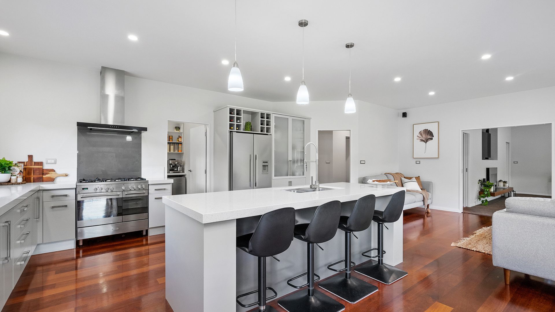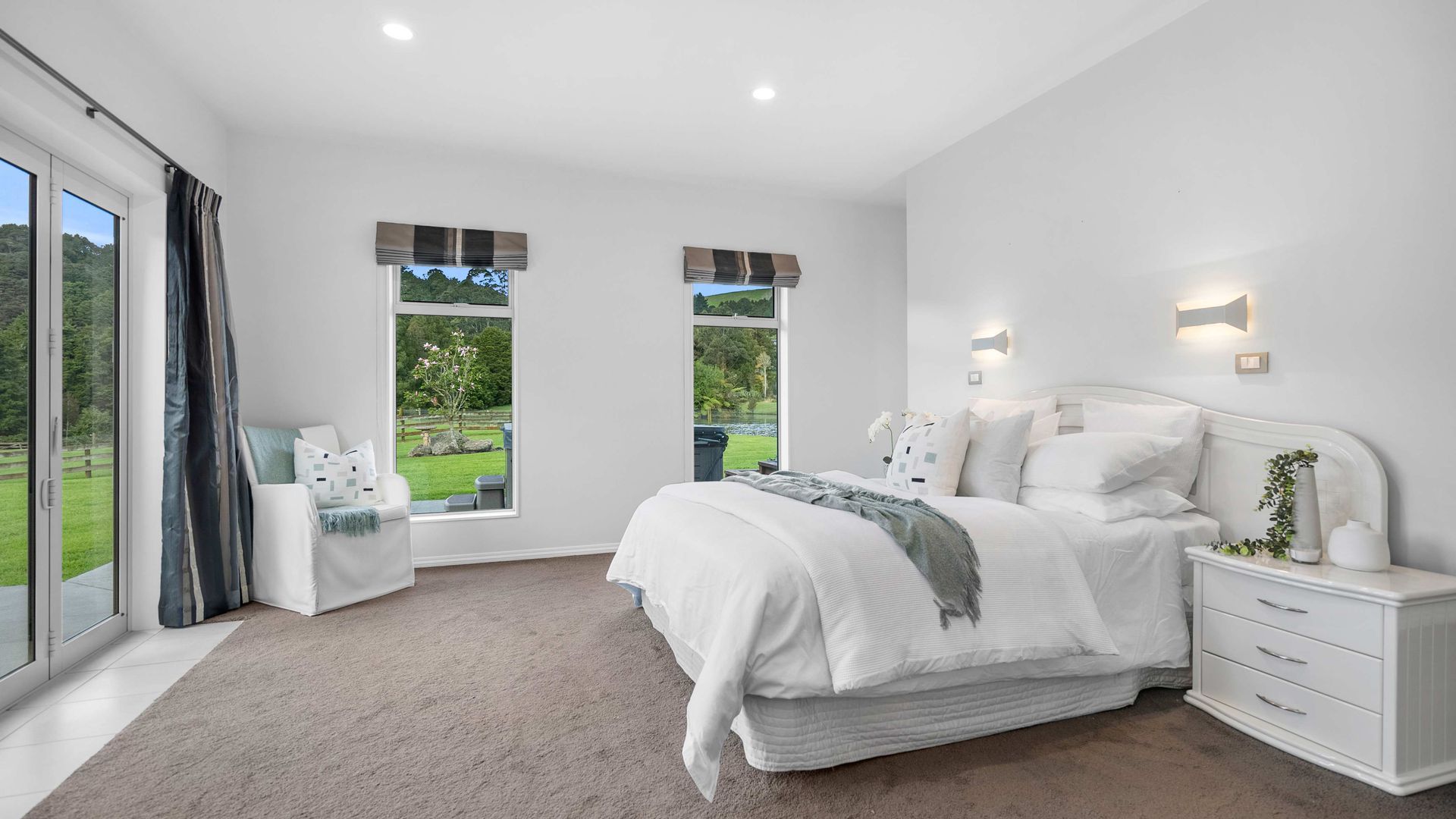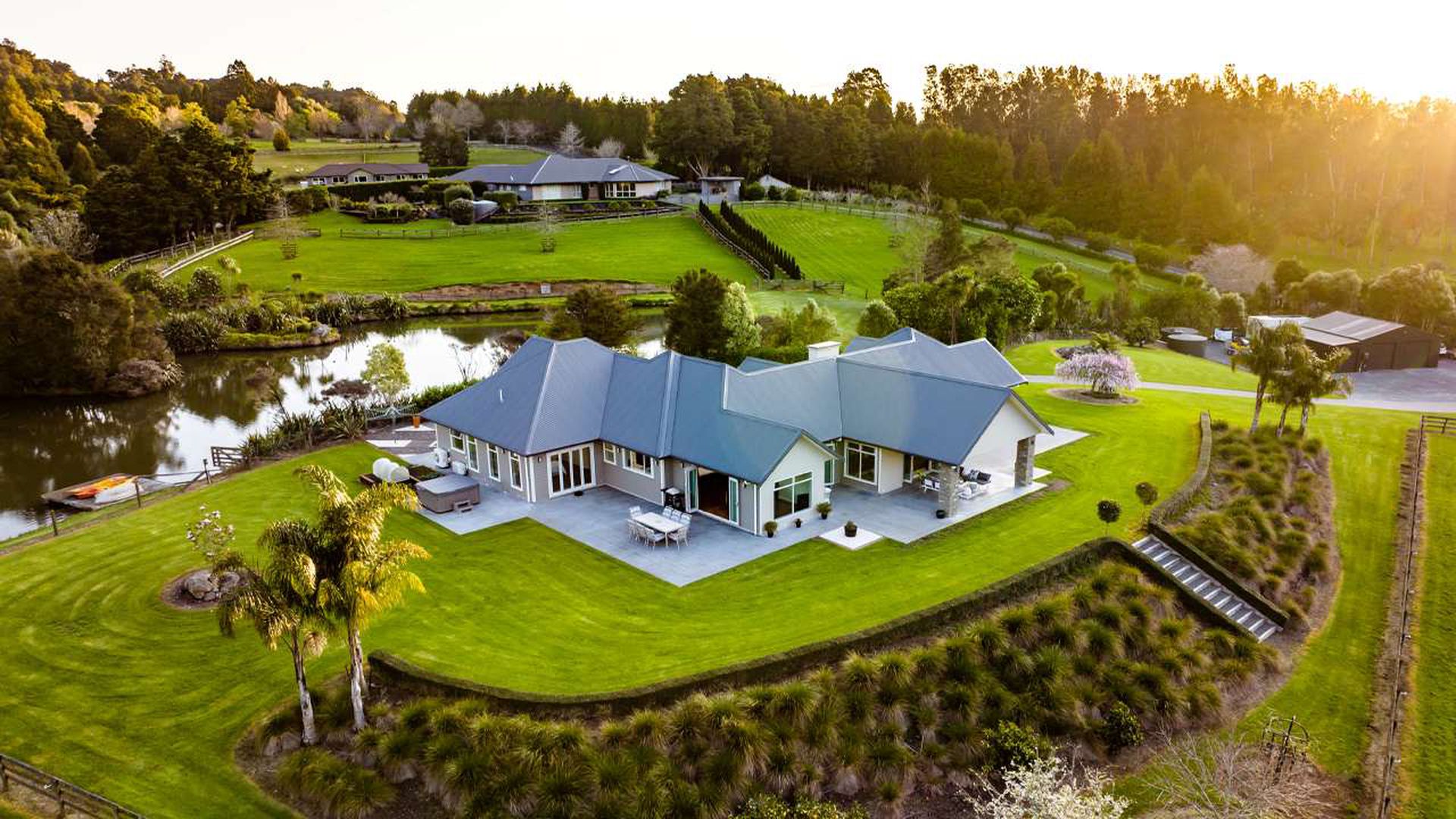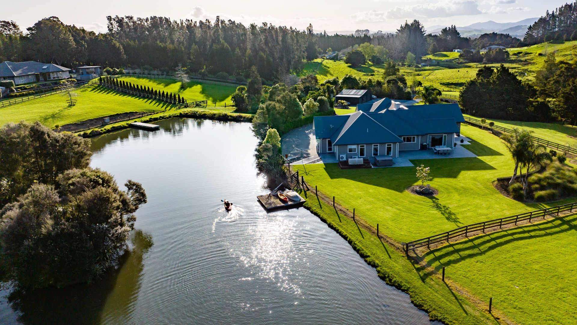 The master suite is private and indulgent with terrace access; the remaining bedrooms are spacious and flexible for family, guests or work. A large laundry and internal-access double garage keep life organised. Outside, sculpted lawns, shelter belts and water create a natural amphitheatre for alfresco living. Kayak and play on the lake, host long lunches under cover, watch the hills turn gold at dusk.